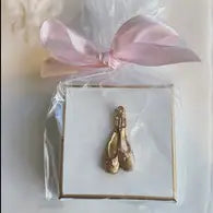 Ballerina Slipper Canvas Art Ballet by Rouge 225. This 4 x 4 canvas is edged in gold and has a hand-gilded pair of ballerina slippers. It comes packaged in a cello bag with a pink ribbon, ready to gift!