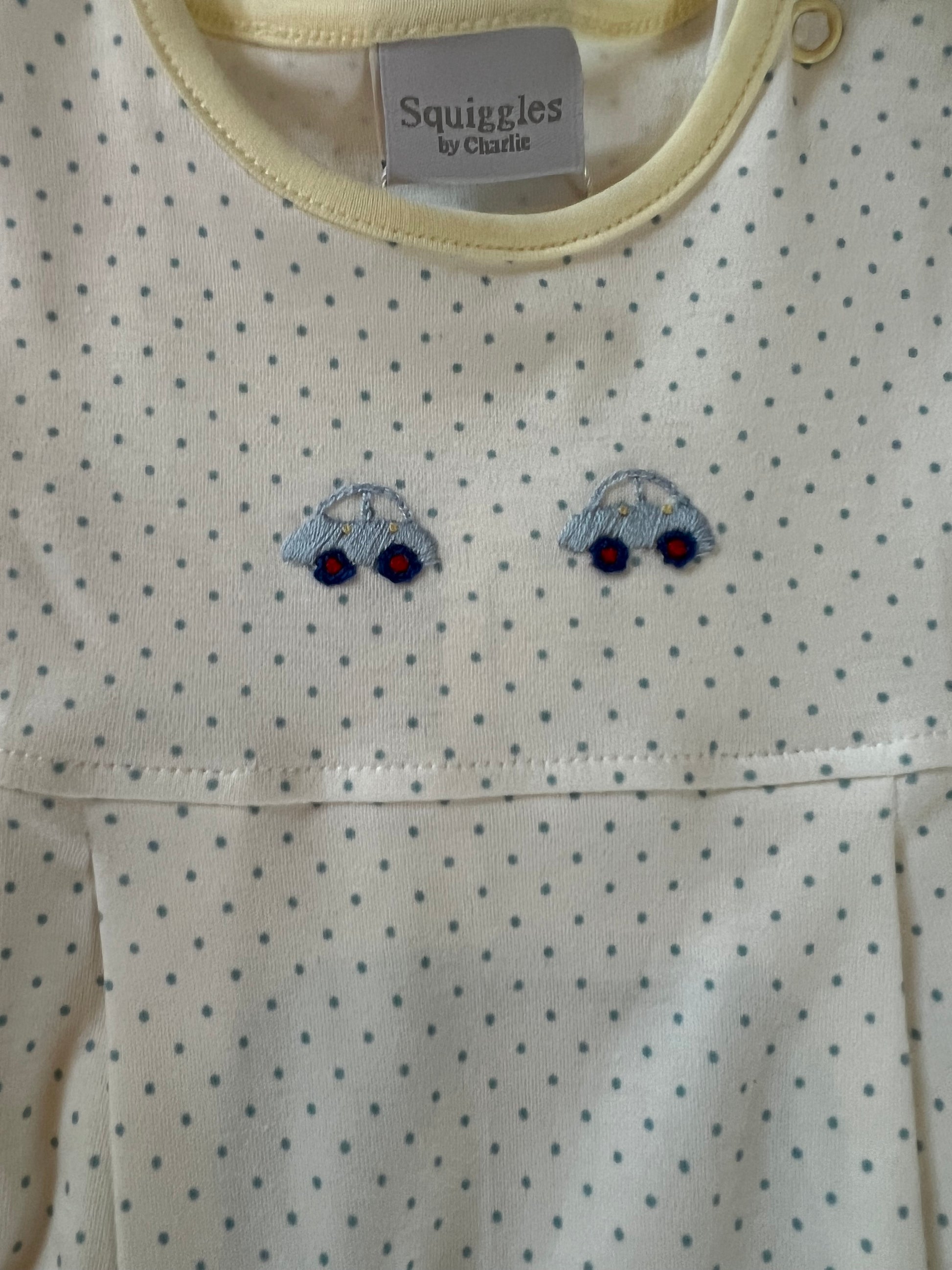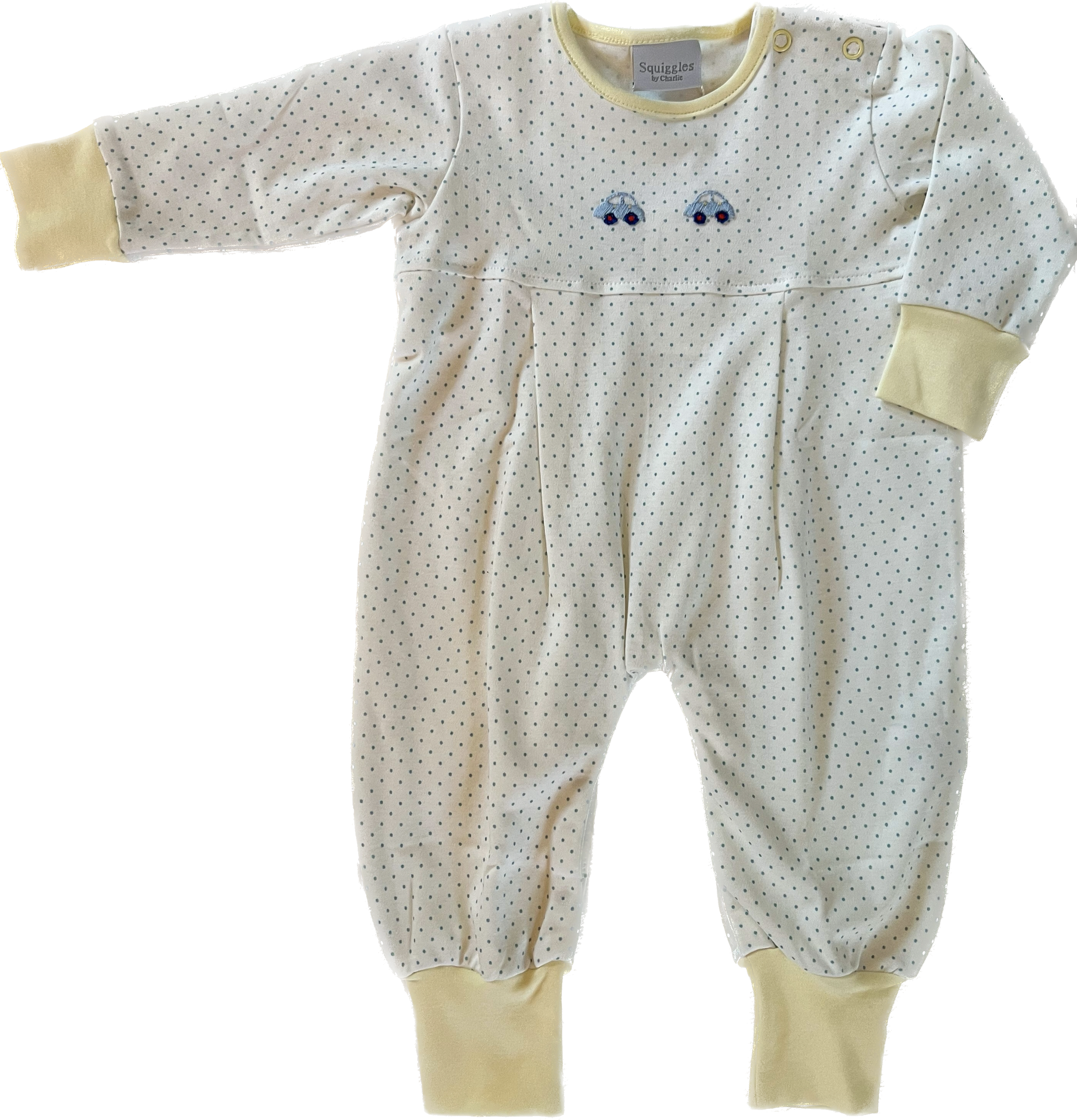 Baby blue dots over white coverall, trimmed in yellow. 100% Peruvian Pima Cotton. Hand Embroidered and just the softest. Perfect cuteness with all the comfort!