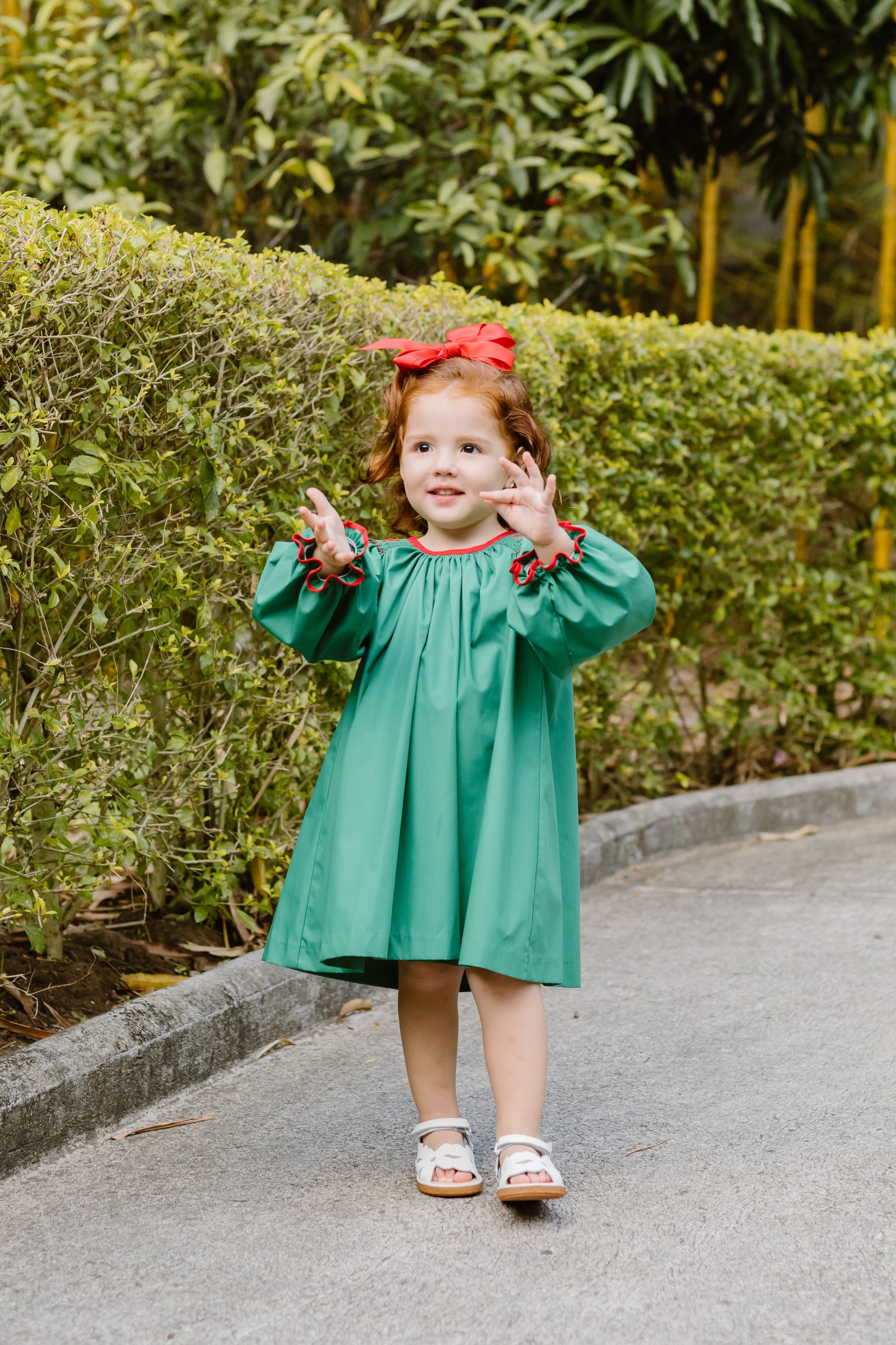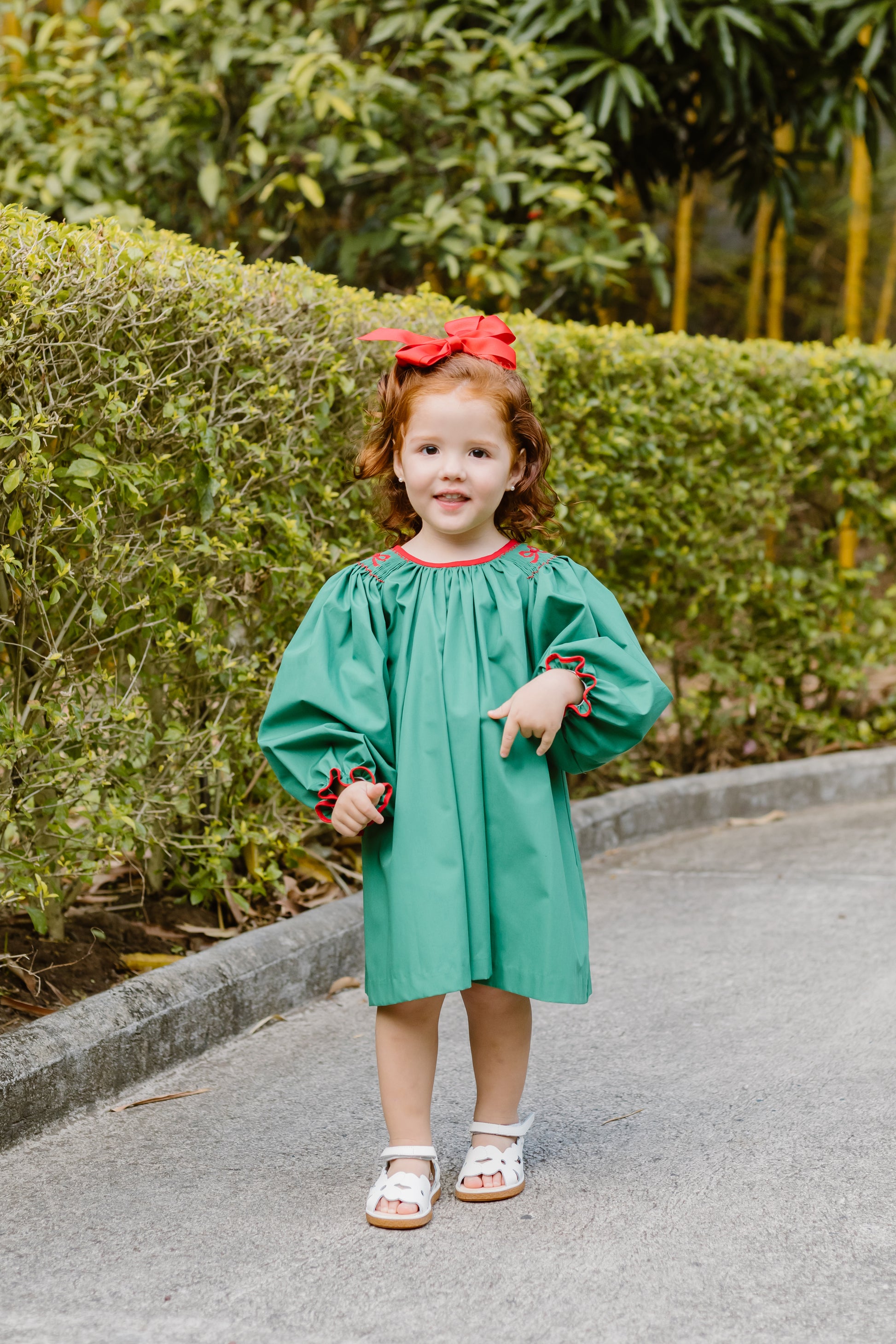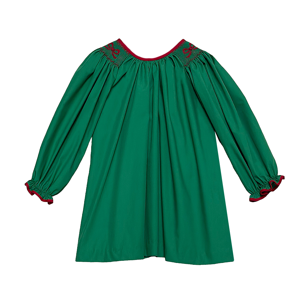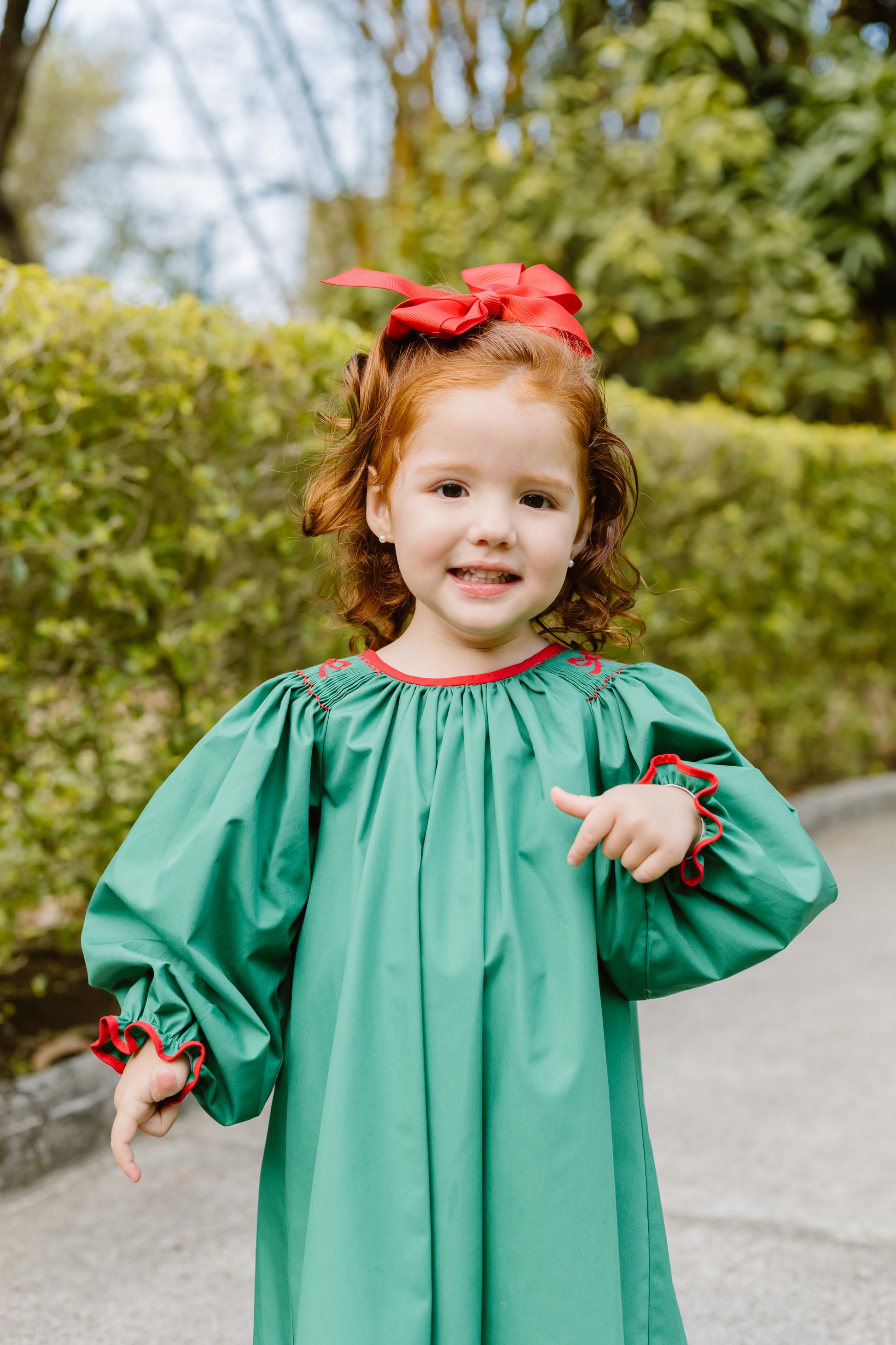 Bow Juno Dress in Kiawah Kelly Green with smocked red bows on the shoulders.