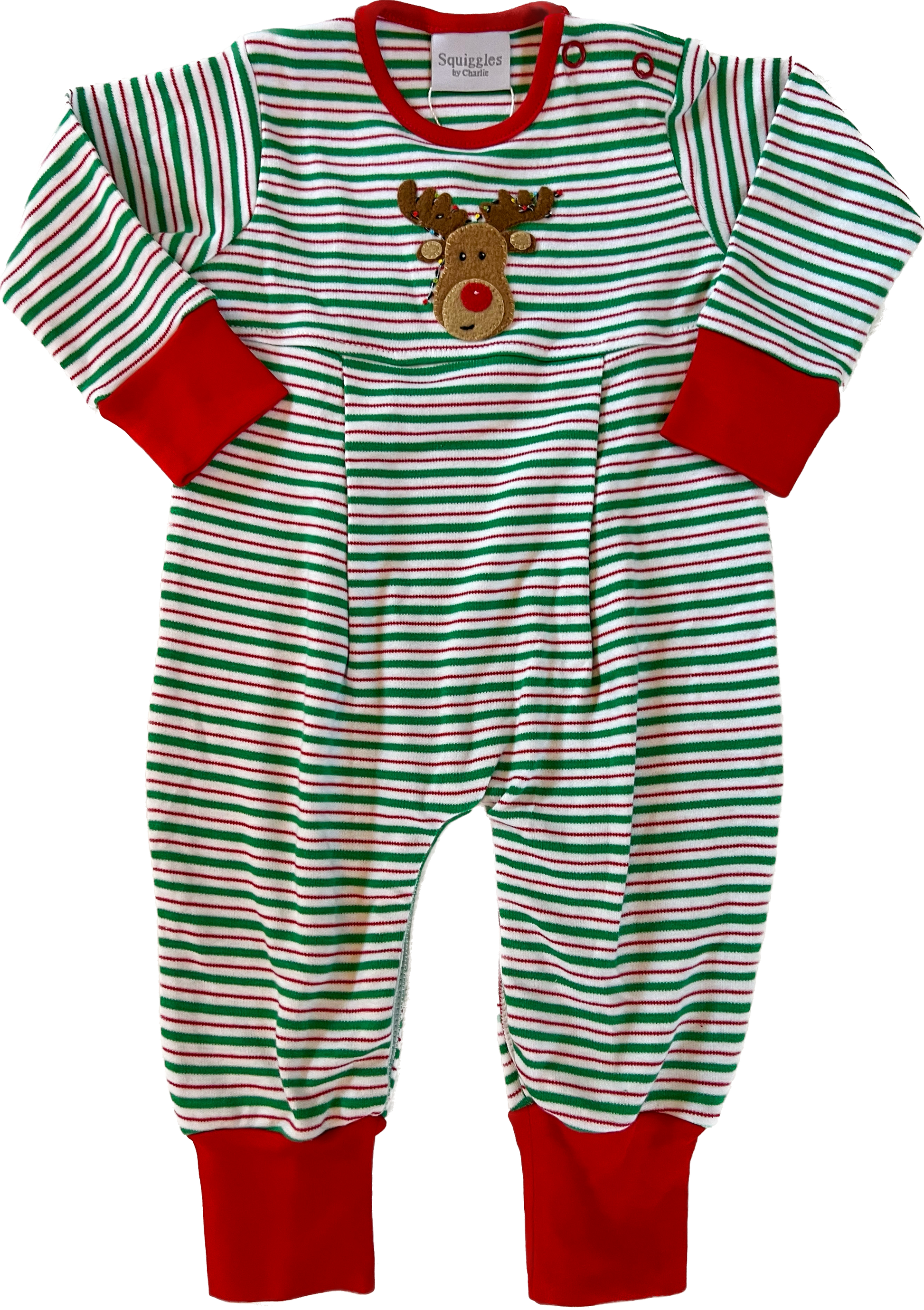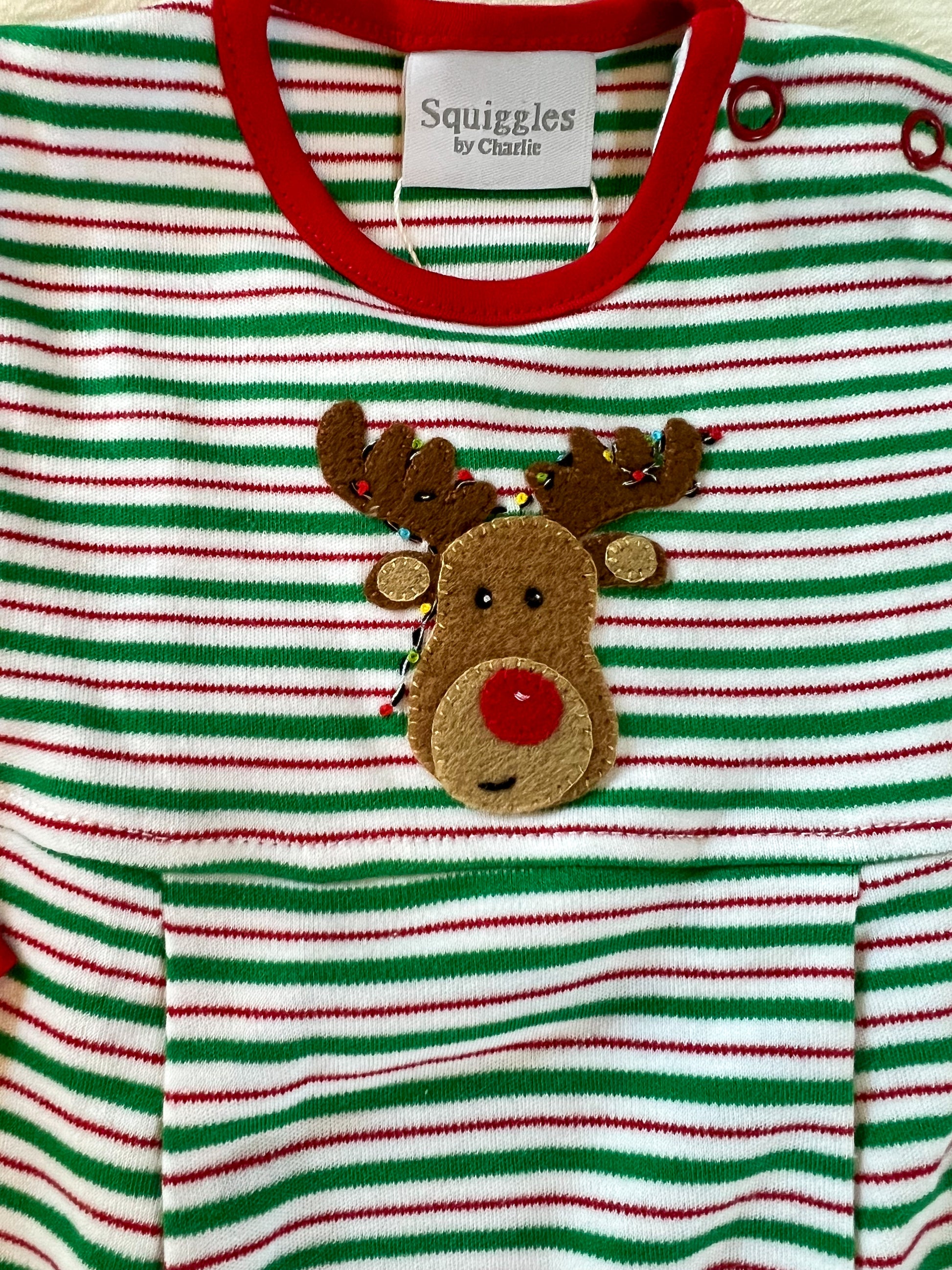 100% pima cotton red, green and white strip boys romper with embroidered reindeer.