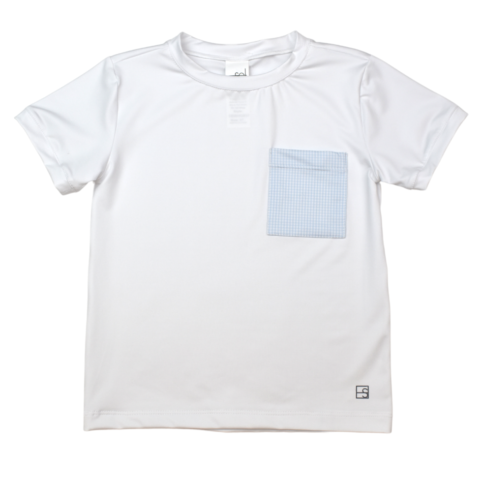 Need a comfy and simple look? From collecting treasures, playing soccer, or running around with friends, the Charlie Shirt in pure coconut athleisure with cotton candy blue minigingham pocket, will be your go-to tee for you active boy! Pairs great with Nathan Short!