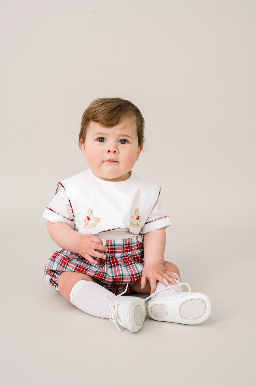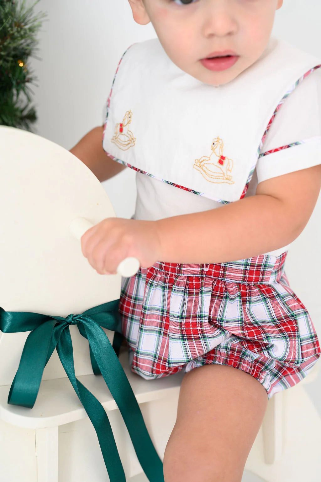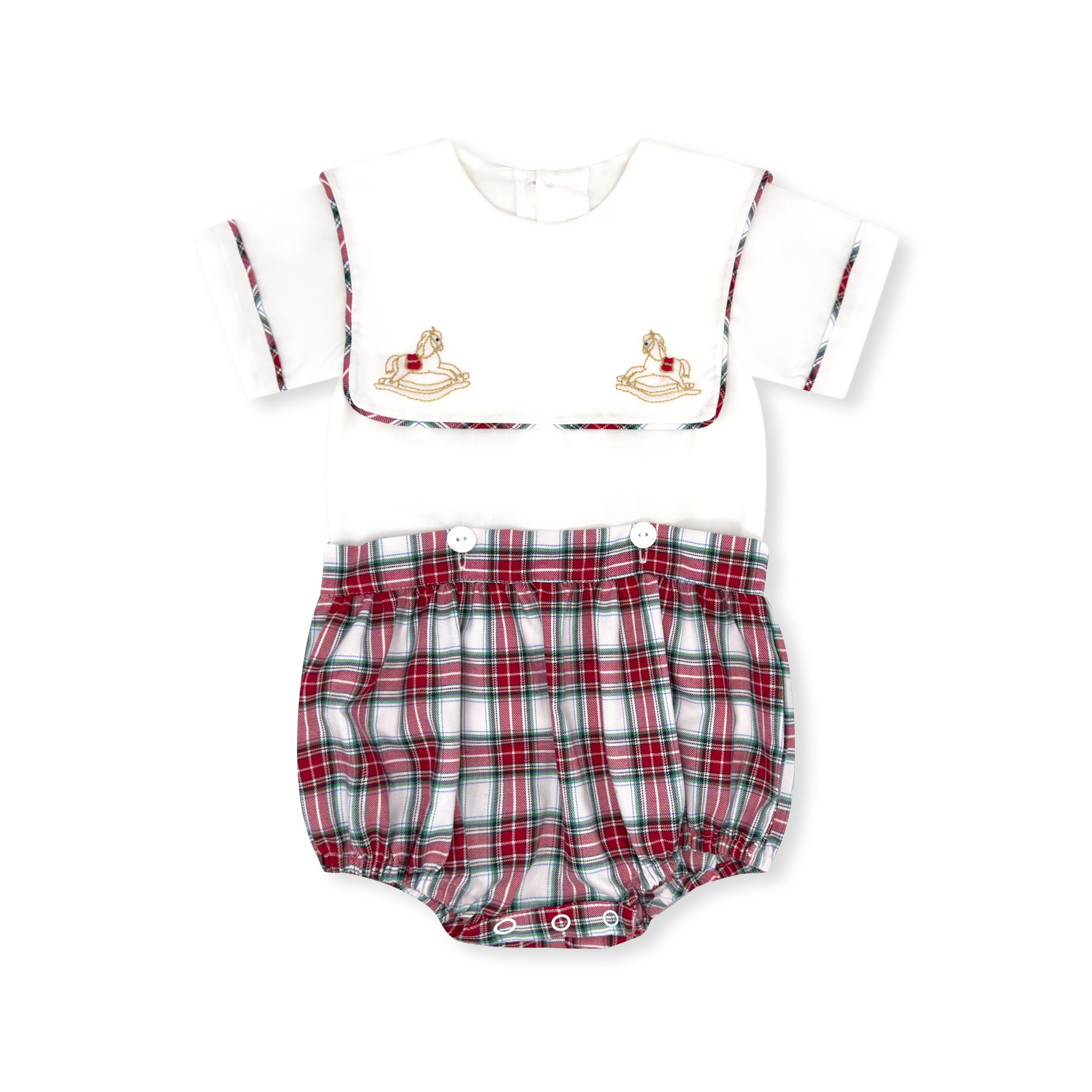 The Christian Button-On Bubble, a timeless and elegant outfit designed for special occasions. This classic ensemble features a woven Highland Park Plaid bottom, paired with a crisp Blessings White top. The square collar is trimmed in matching plaid, adding a cohesive, stylish touch. Delicate rocking horse embroidery on the collar gives it a charming, playful detail. The button-on design provides a polished, tailored look. This bubble is the perfect addition to your little boys' holiday wardrobe.
