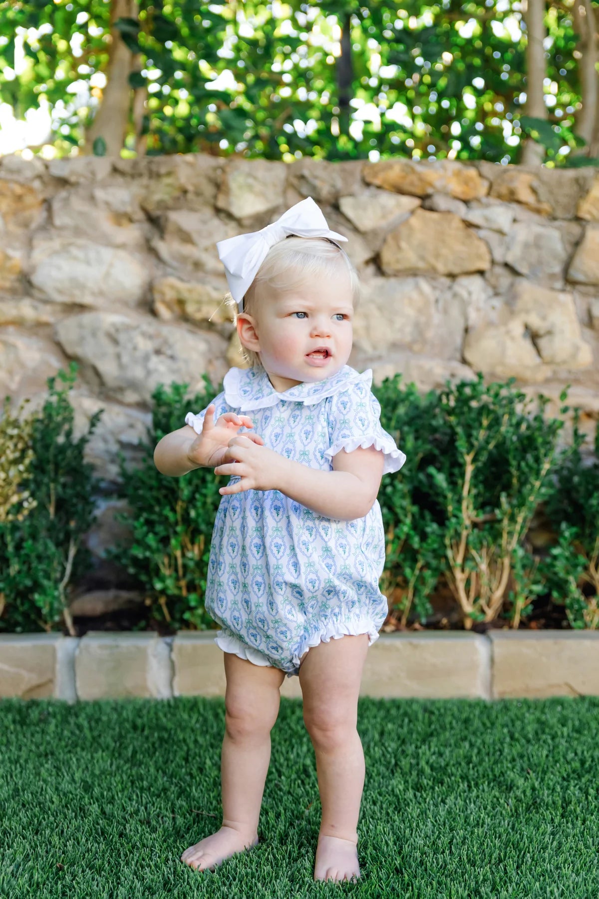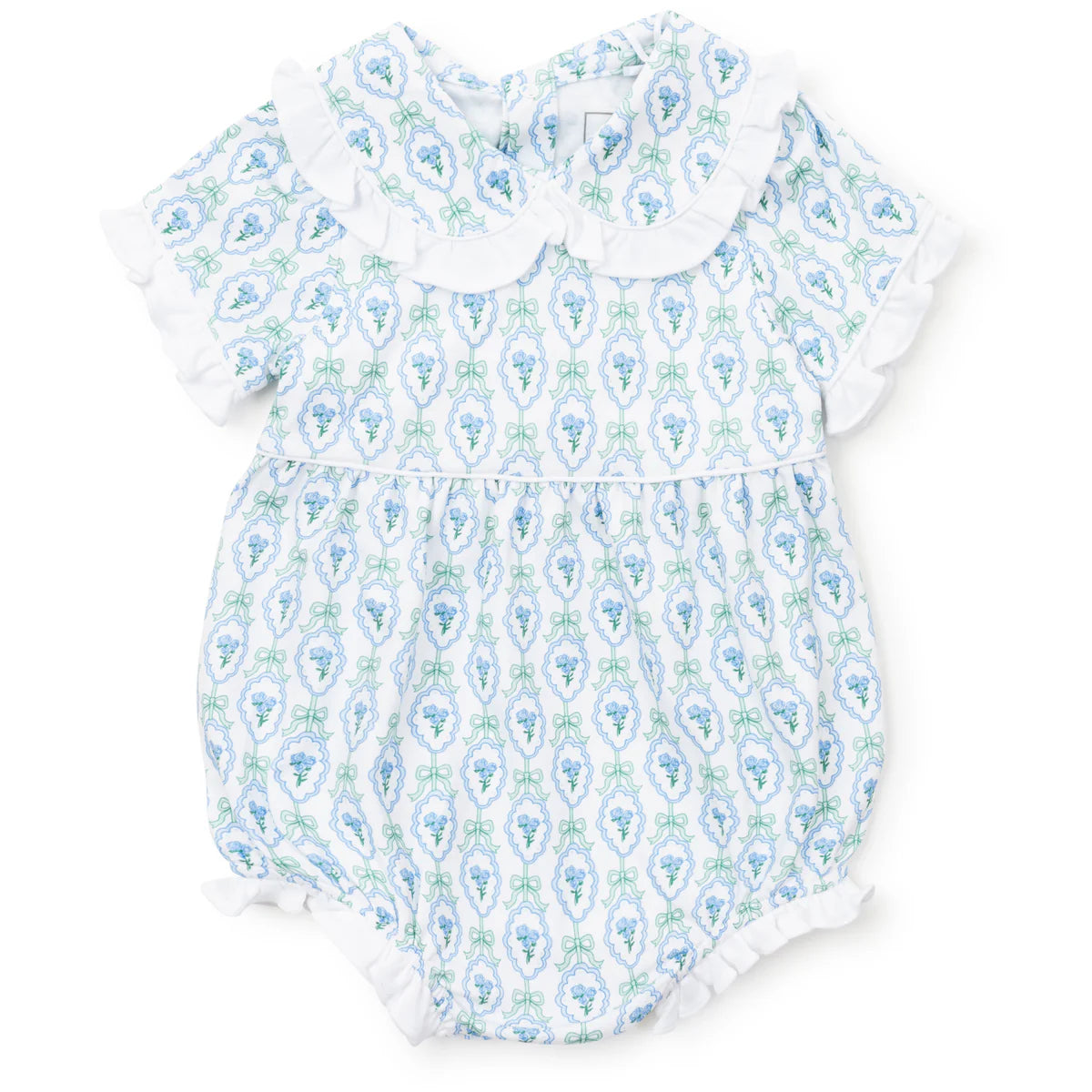 Girls' ruffled peter pan collar short sleeve pima bubble. Button closure in back and three snaps in the stride. Made from 100% Peruvian Cotton.