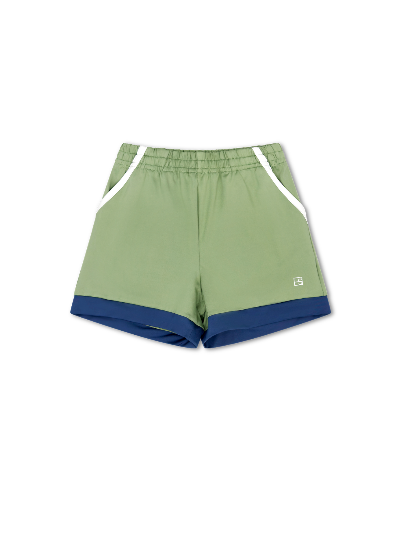 Boys athletic short in pistachio green and baton rouge blue. Pistachio green athleisure with pure coconut white welting and Baton Rouge Blue leg bands