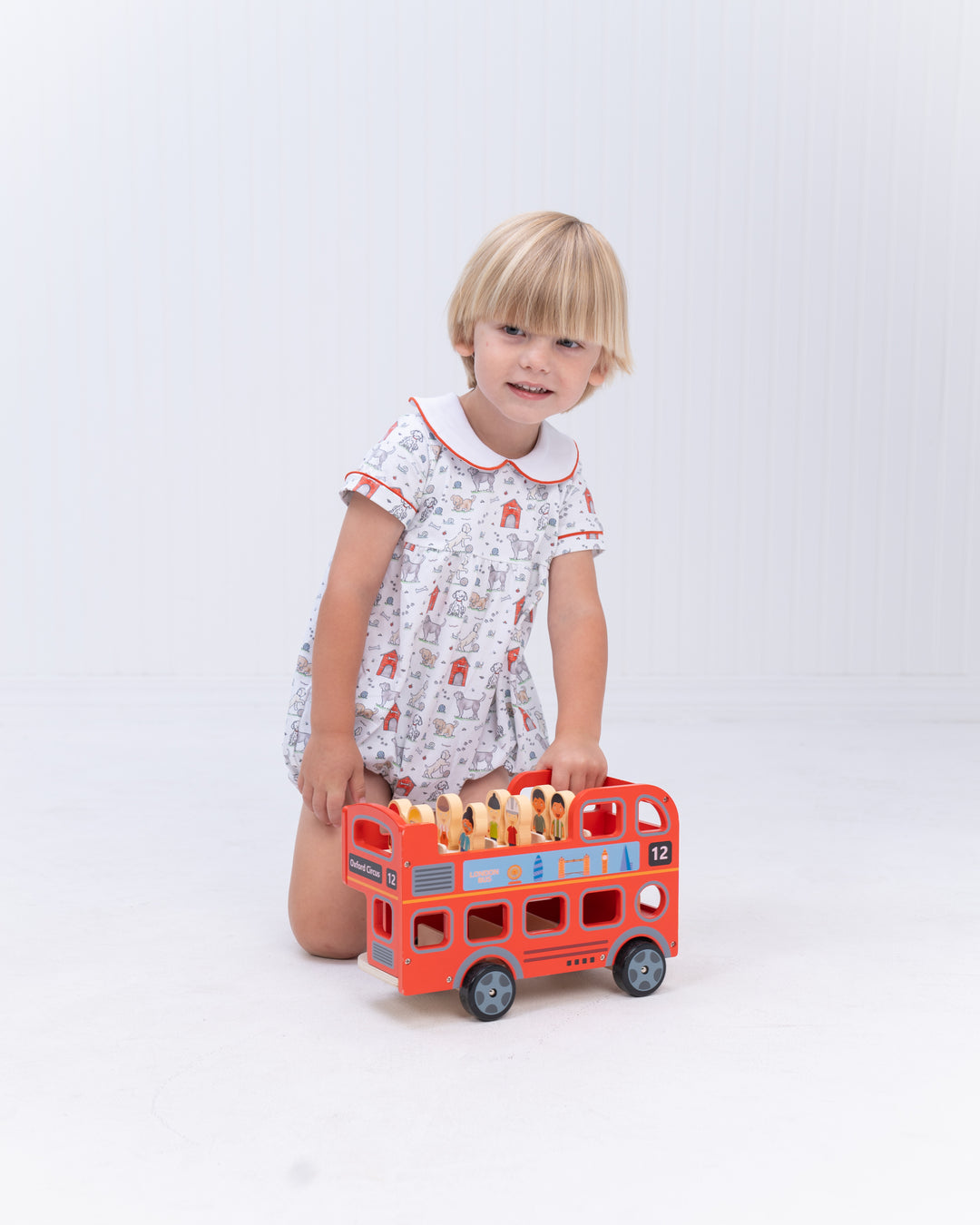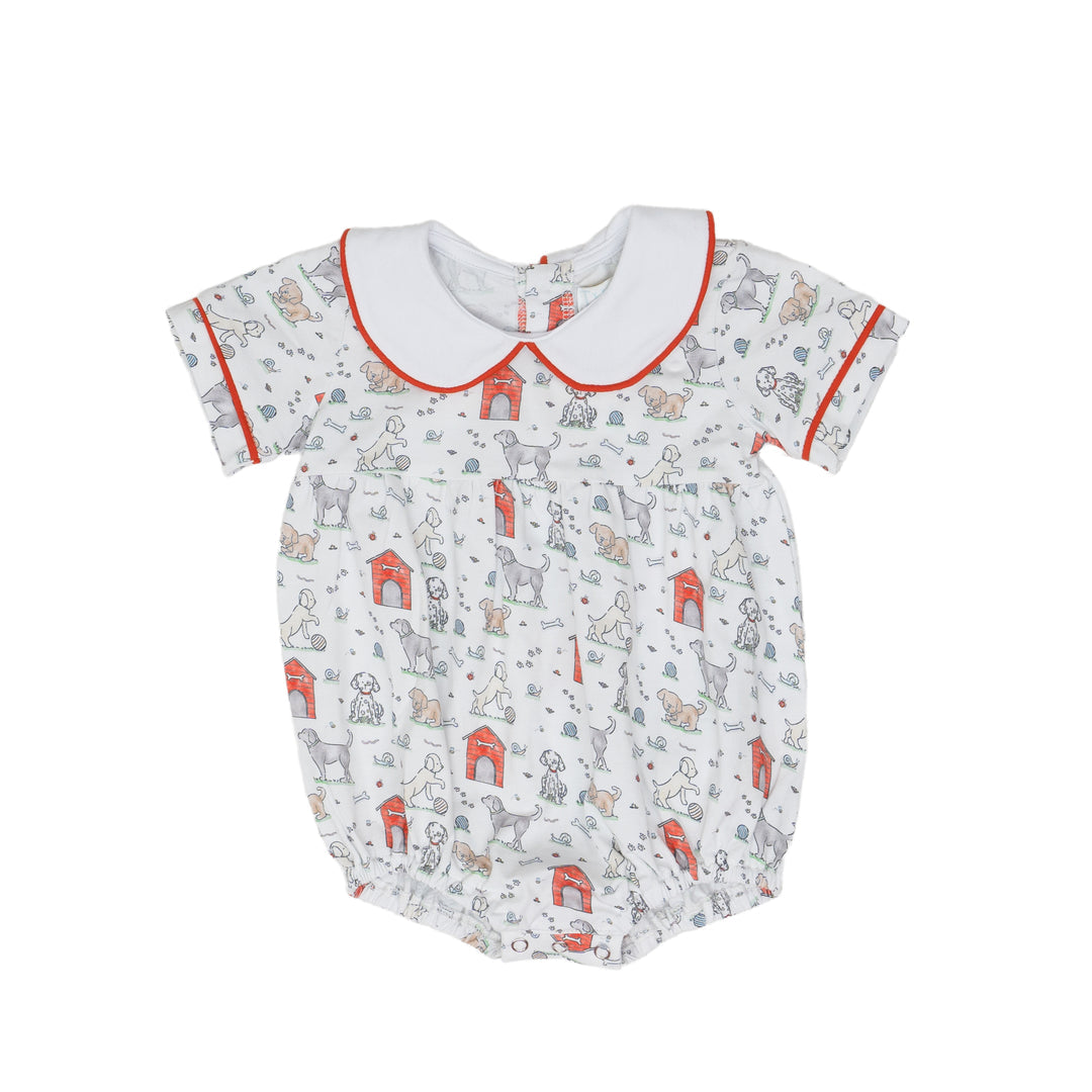 This boys knit bubble features a charming puppy print, accented with a classic white collar and fun red piping. Perfect for playdates, parties, and everyday adventures.
