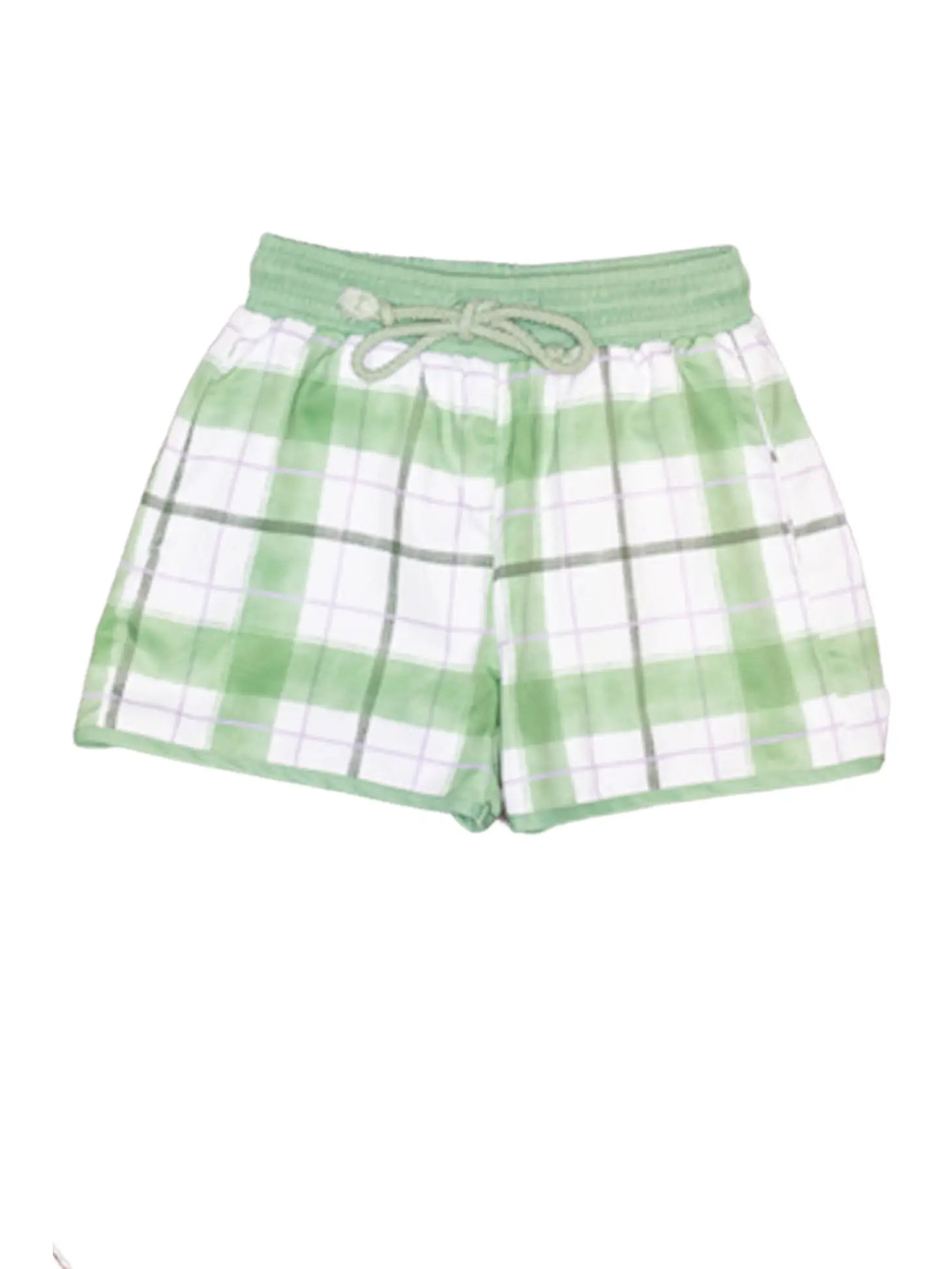 These handsome swim trunks by Grace & James feature green and white plaid with fun pops of lavender. These trunks are sure to make them feel and look cool in the hotter weather.