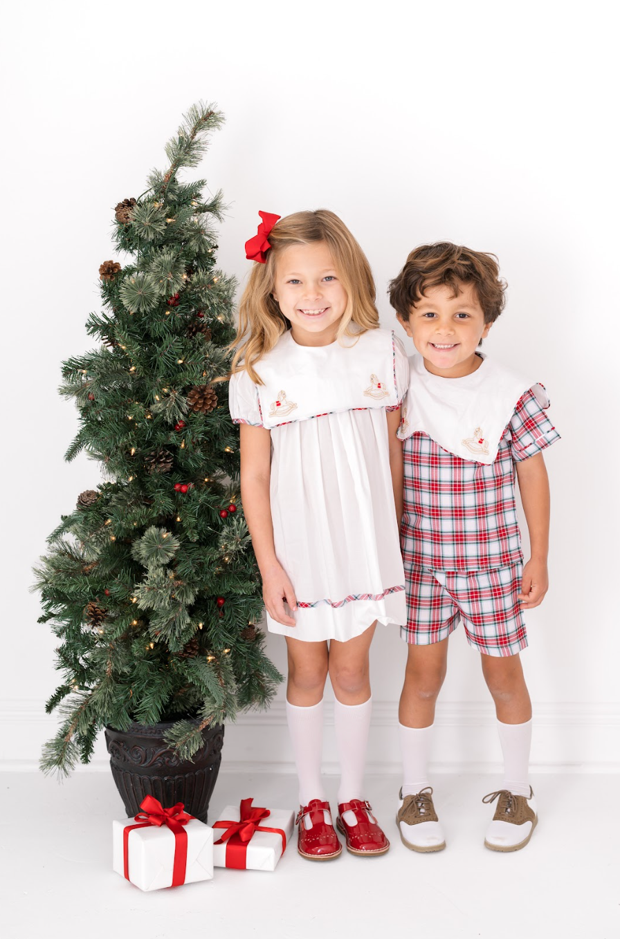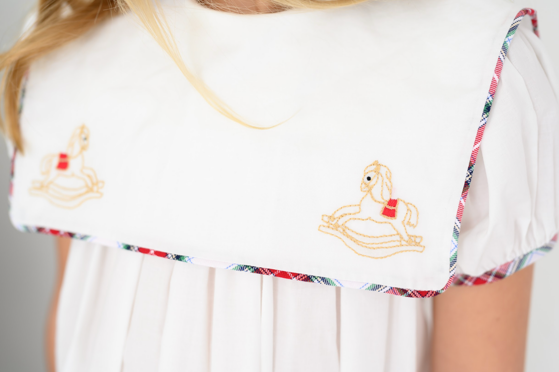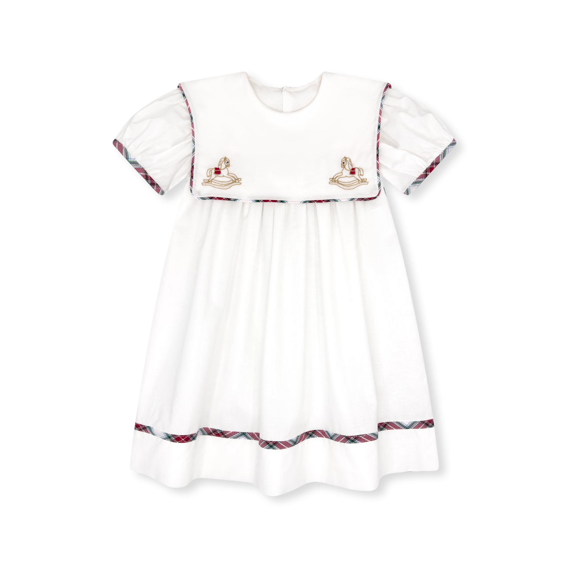 Best selling Hope Chest dress is back this season and perfect for the holiday season. This Blessings White batiste dress is trimmed in Highland Park Plaid and the square collar has the sweet detail of embroidered rocking horses. Your little girl will be the best dressed at all your holiday parties.