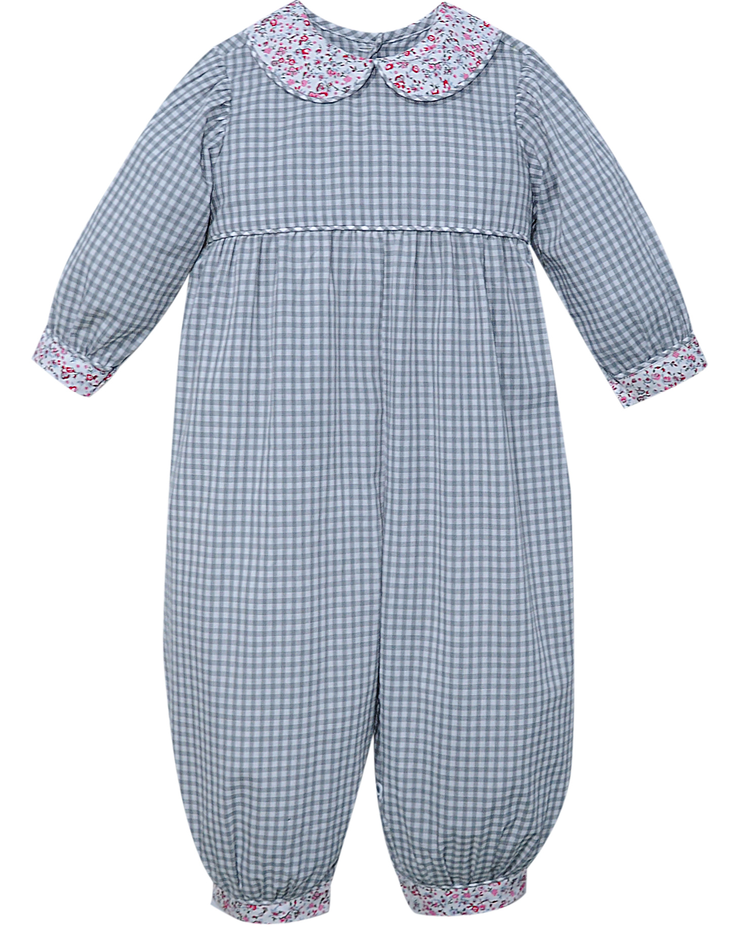 Gray Kate Girl Romper with floral trim.