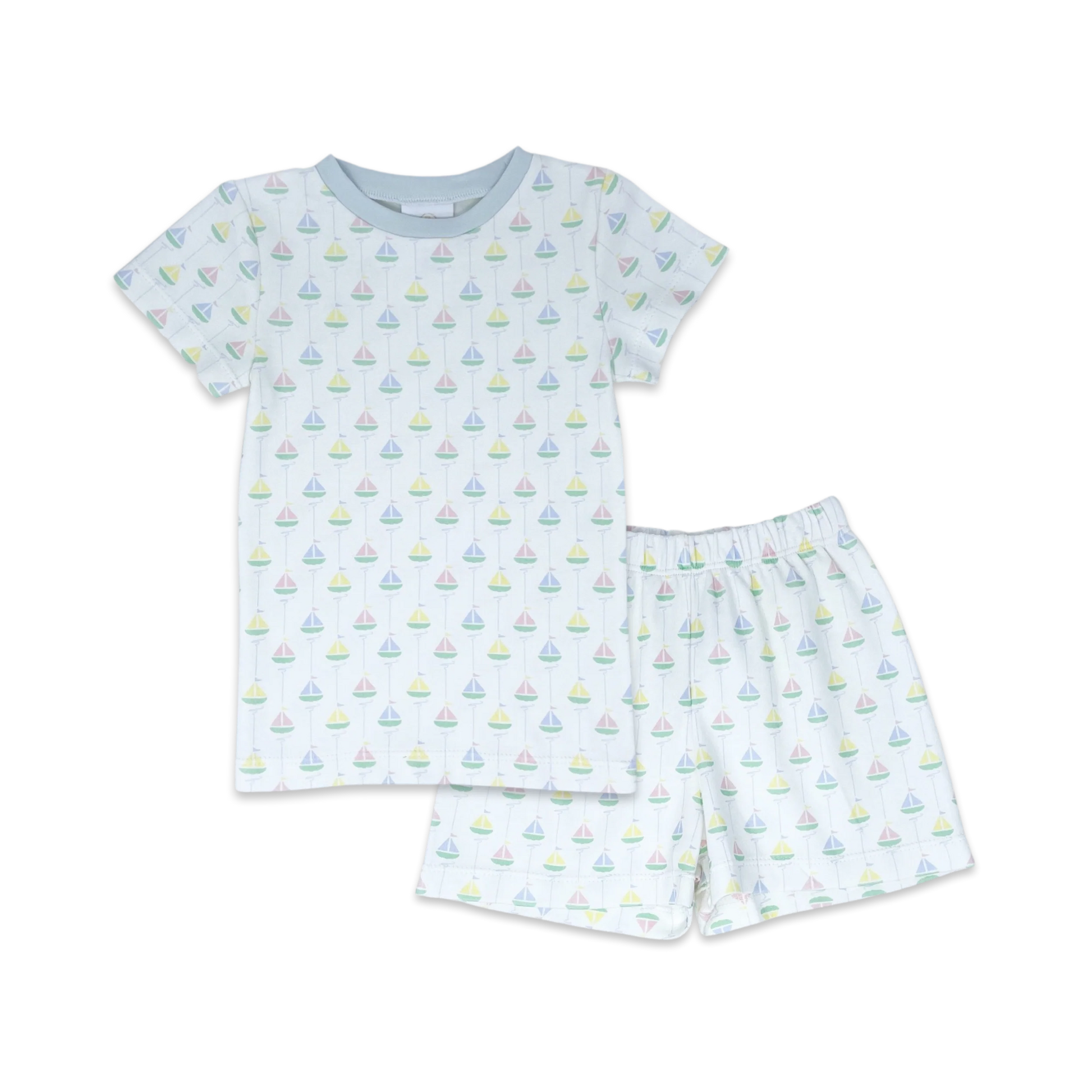 Sweet dreams little one! Our Landon Short Set with short sleeves and matching short in our custom sailboat print are as cute as they are comfy.