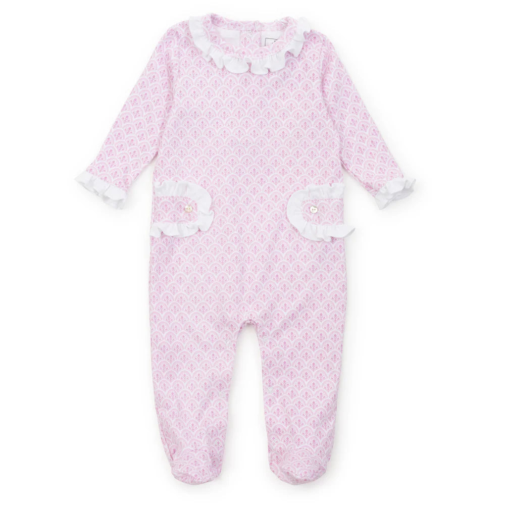 Lucy Romper - Scalloped in Pink. Long sleeved pima cotton footed onesie with ruffles around neck, collar and side plackets. Snaps in stride and back of neck. Made from 100% Peruvian Cotton. This item fits true to size and will have a relaxed, comfortable fit when new. Garments that are 100% cotton will shrink when washed. We advise sizing up if you feel you are between sizes.