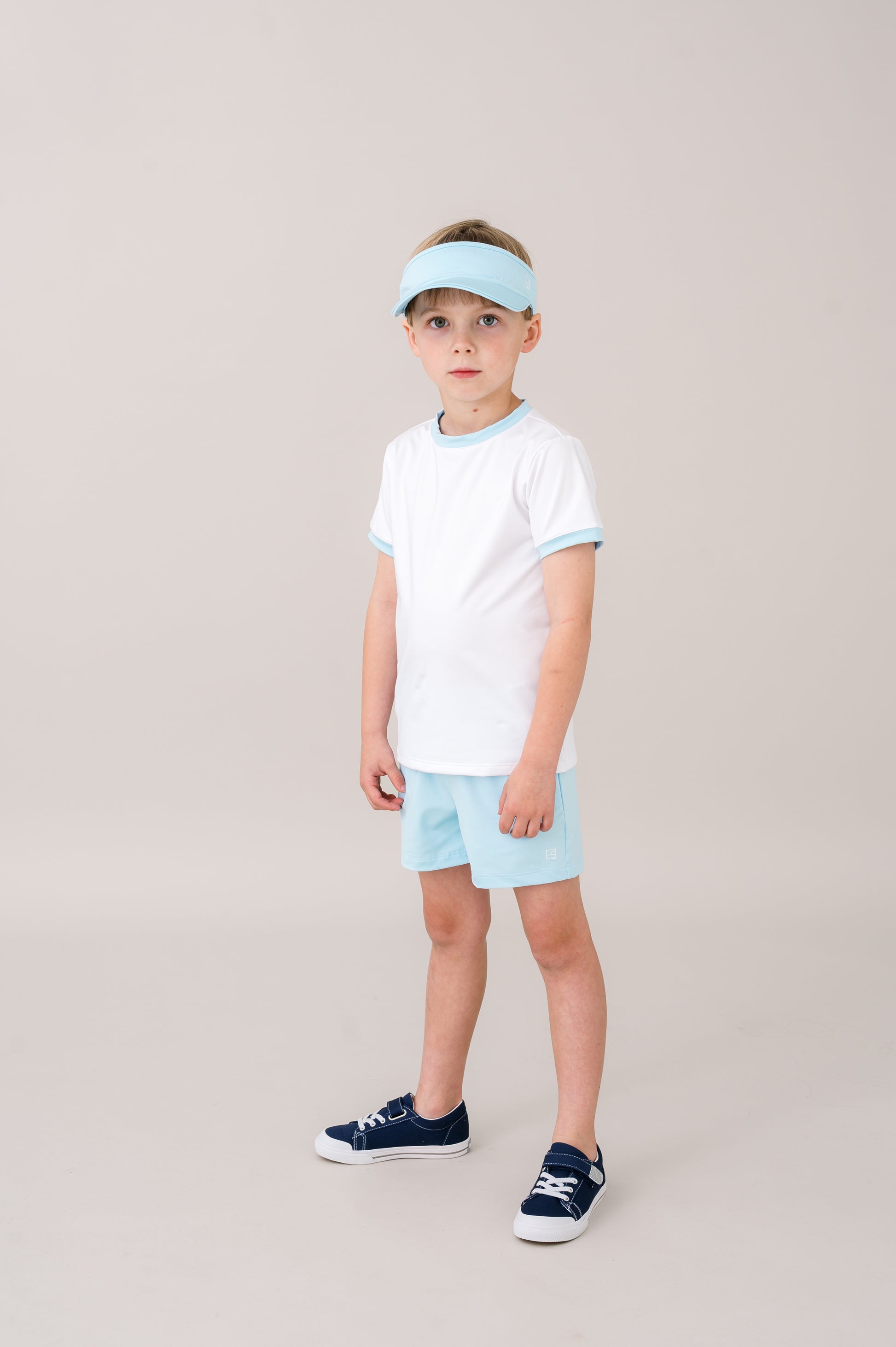 Boys athletic shorts in cotton candy blue. Cotton candy blue athleisure with pure coconut white welting