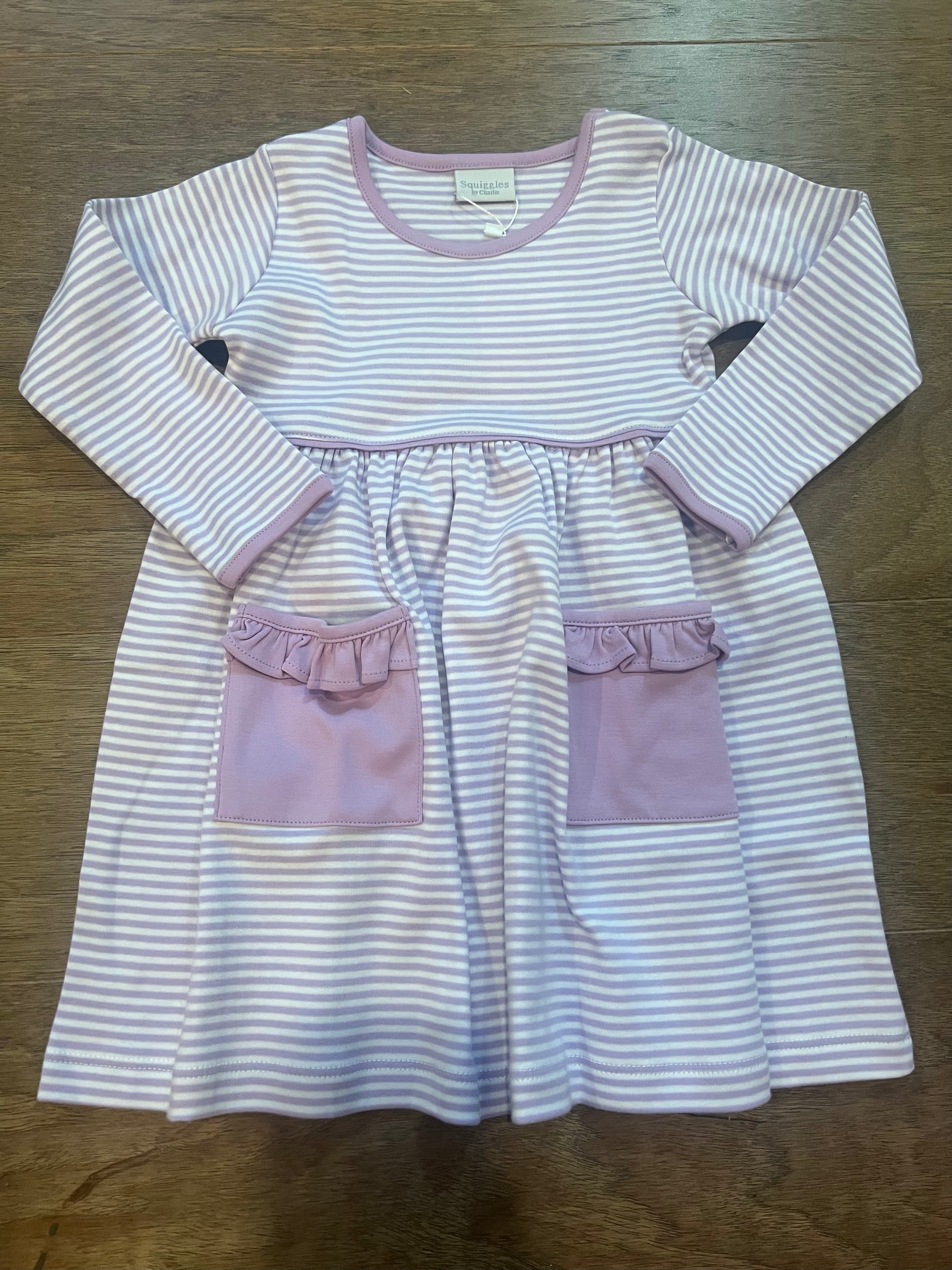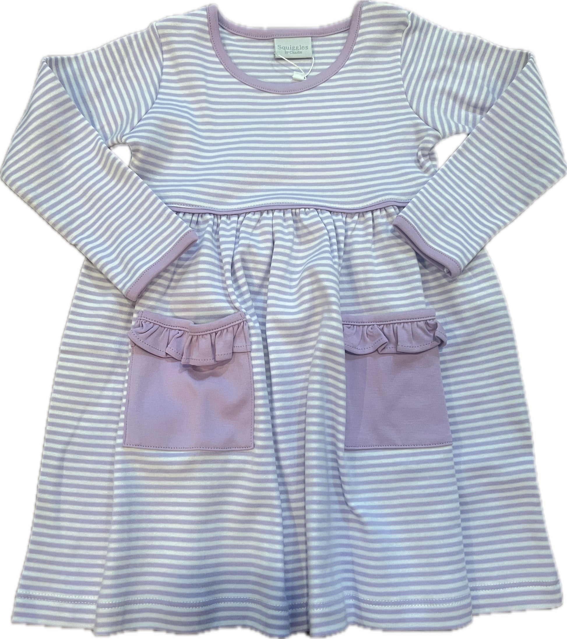 Popover Long Sleeve Dress in Lavender/White Stripe w/Ruffle Trim Pocket. 100% Pima Cotton.